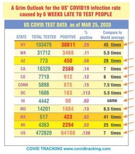 Như chúng ta đã biết trong bài vừa qua cũng như hàng ngàn báo động của chuyên gia khắp thế giới khi nhìn vào data và trải nghiệm của Trung quốc, Hàn quốc và Ý, đó là TESTING cần phải thực thi cấp bách tại Mỹ nếu họ thưc sự muốn ngăn chận làn sóng tràn lan của CV19 nhất là trong khi hệ thống y tế công cộng của Mỹ không đủ khả năng chăm sóc cho hàng trăm ngàn bệnh nhân cùng lúc vì tiền bạc và bảo hiểm Obamacare đã bị chính phủ Trump cố tỉnh rút rỉa cho súng đạn, làm giàu cho bọn tài phiệt trong đảng Cộng Hòa. Hiện nay mức testing của Mỹ chỉ hơn VN… một bậc vì White House quá kiêu kỳ không thèm dùng bất cứ Test Kits nào của nước ngoài, kể cả WHO trong một thời gian quá dài. Với COVID19, 1 ngày tương đương với 1 tháng không chữa trị cho những bệnh truyền nhiễm khác: