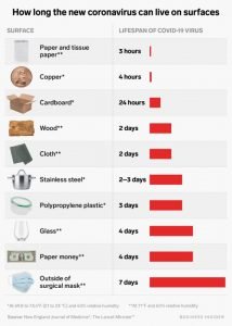 Siêu vi trùng Covid-19 thường lây lan dễ dàng qua các giọt nước miếng khi người nhiễm bệnh ho hoặc hắt xì. Các giọt nước này mang các hạt virus bay trong không khí và có thể bay vào mũi hoặc miệng của người khác hoặc khi họ hít chúng vào. Tuy vậy, một người vẫn có khả năng bị nhiễm Covid-19 nếu họ chạm tay vào bề mặt của các thứ vật dụng có các hạt virus ở trên đó và sau đó chạm tay vào miệng, mũi hoặc mắt của họ. Tuổi thọ của siêu vi khuẩn Covid-19 trên một bề mặt phải phụ thuộc vào nhiều yếu tố khác nhau, bao gồm: nhiệt độ, độ ẩm ướt trong môi trường đó và loại nhiên liệu tạo ra bề mặt mà chúng rơi trúng.